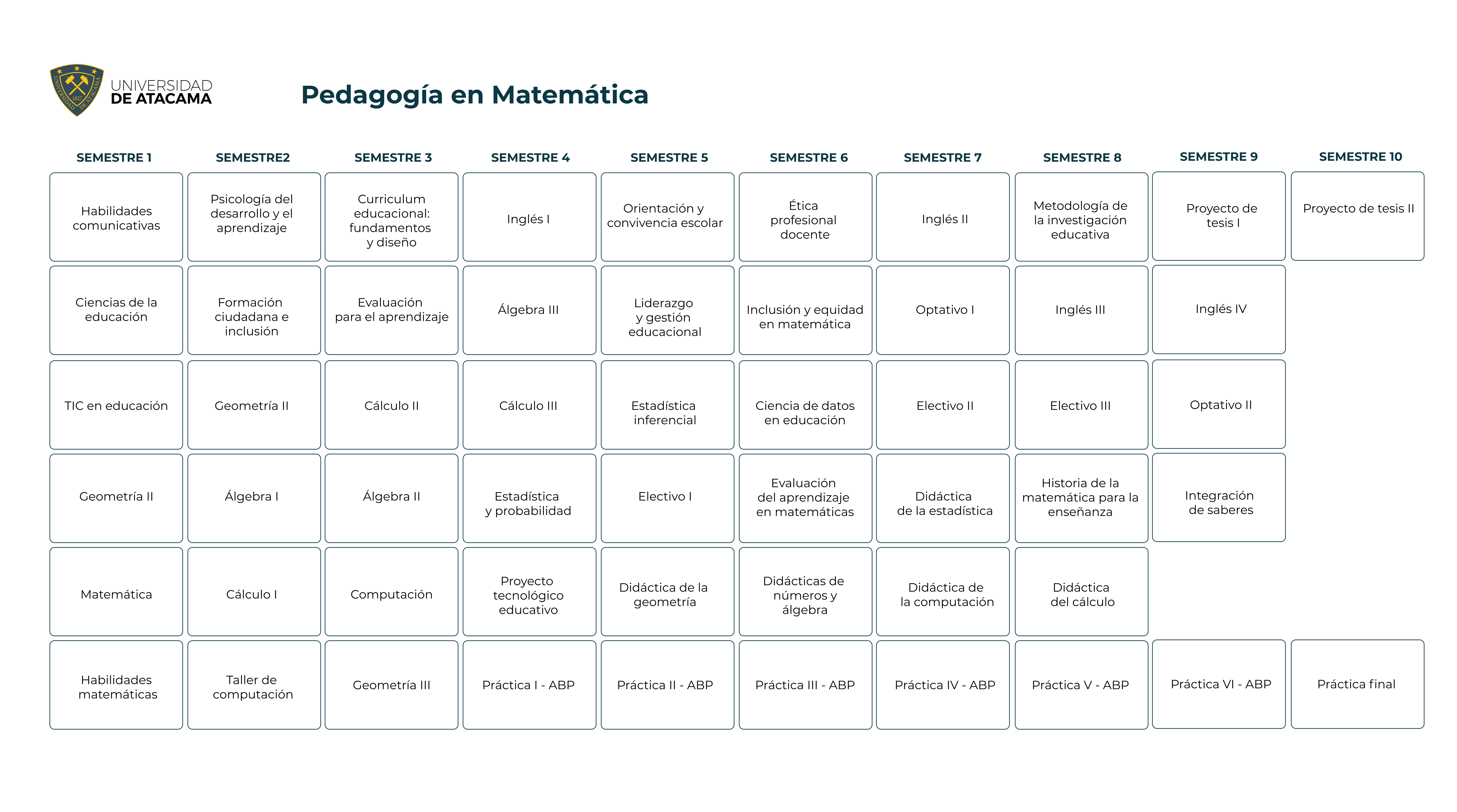 La carrera de Pedagogía en Matemática, que otorga el título de Profesor/a de Matemática y el grado de Licenciado/a en Educación de la Universidad de Atacama, forma profesionales altamente competentes en matemáticas, capaces de enfrentar los desafíos del entorno educativo y comprometidos/as con la sociedad. Su formación se fundamenta en principios y valores institucionales de una sociedad democrática, con el objetivo de aportar al desarrollo de la comuna, la región y el país.